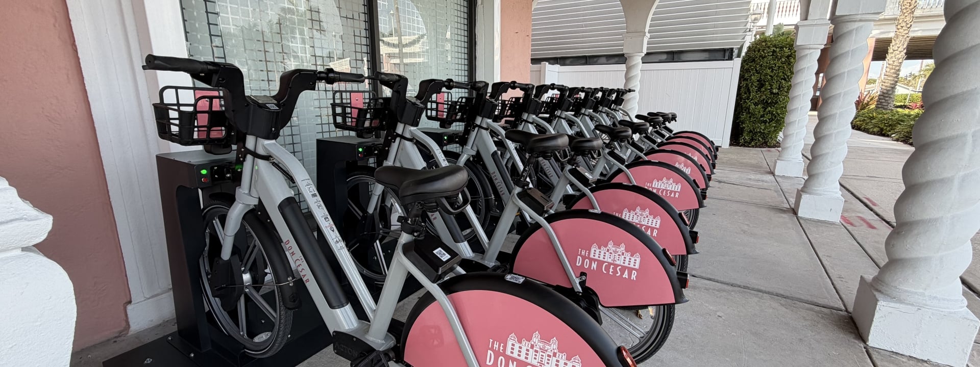 Rent e-bikes at The Don CeSar for $20 per hour, with the first hour complimentary for registered guests. Guests receive an exclusive access code at the Front Desk upon check-in and unlock bikes using the ZYBRA Plus App. E-bikes are located on the South End sidewalk.Pedal bikes are available at Beach House Suites for $12 per hour, located on the Ground Level beneath the lobby. All rentals are first come, first served. E-bikes operate from 6:00 AM–6:00 PM (Winter) and 6:00 AM–8:00 PM (Summer). Bikes may be returned at any time.