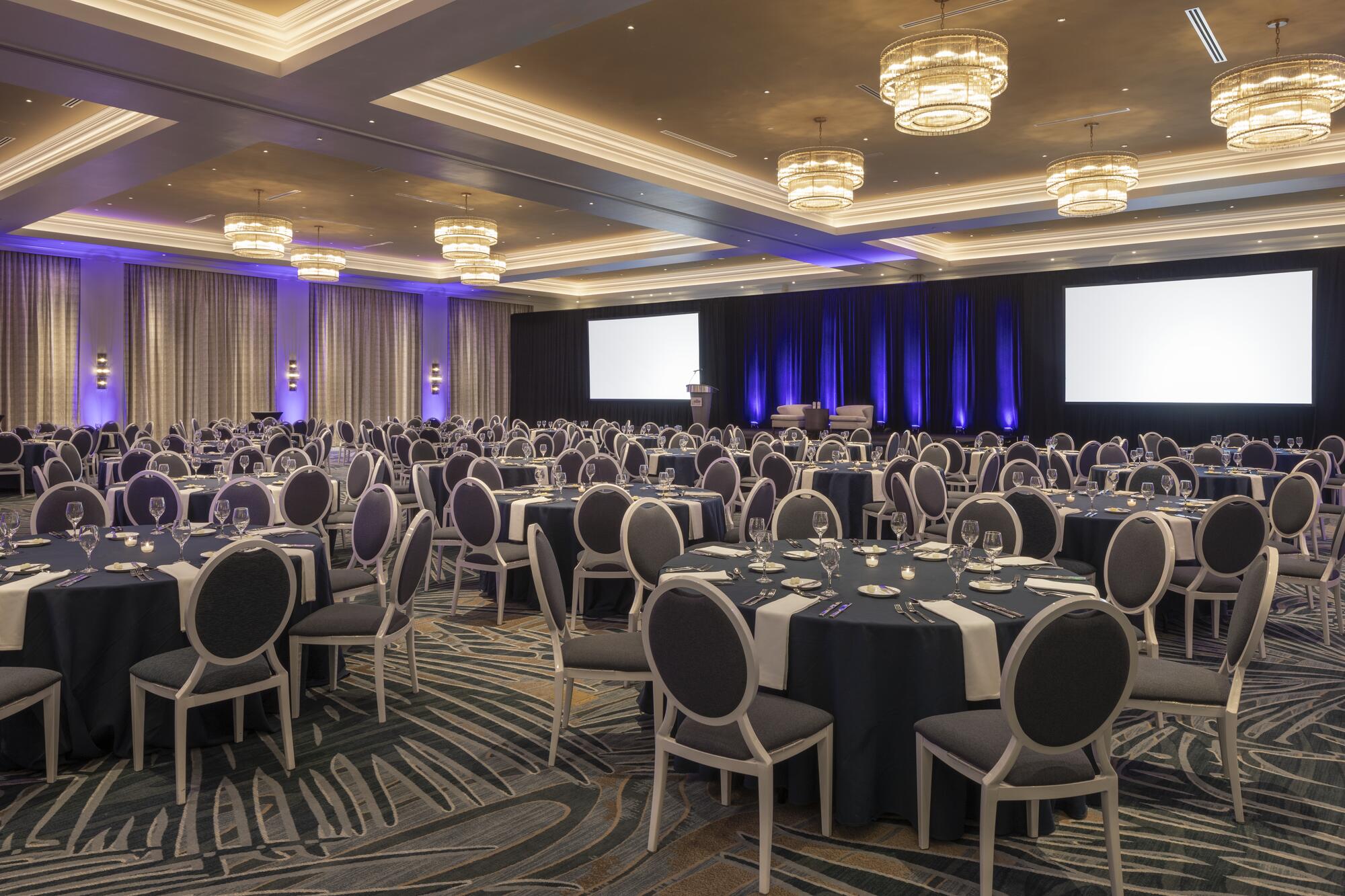 Soaring ceilings, abundant natural light, and panoramic Gulf views create an inspiring backdrop in The Royal Ballroom. This 7,400-square-foot venue is ideal for corporate meetings, large conferences, and executive events, hosting up to 420 attendees with options for plated or buffet dining, or theater-style seating. The adjacent marble foyer offers a sophisticated space for receptions and networking.
